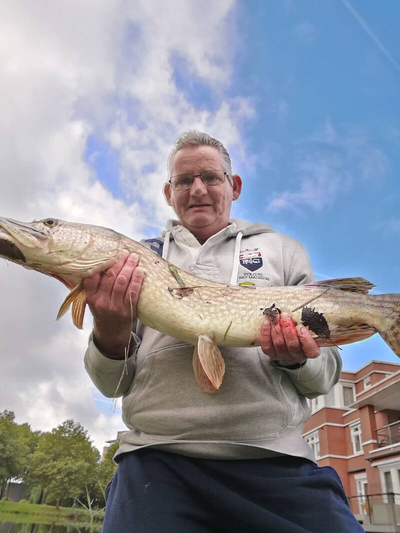 Doodaasje eraan en slepen maar , voor dat ik ingegooid had moest ik me broer al helpen met het scheppen van zijn eerste snoekbaars , een nette van 45cm . Snel ingooien en na 2 min beet dobber schiet weg aanslaan voel een snuk en eraf na het inhalen blijkt me haak weg te zijn me vermoeden een snoek .