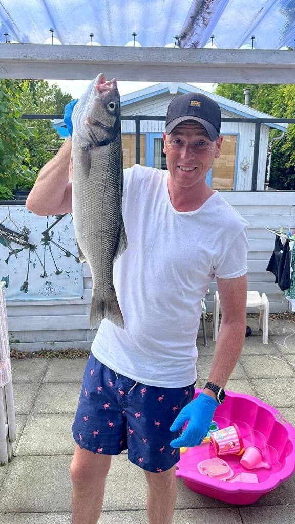 Even het aas opmaken wat ik nog over had van de vorigen sessie. Nog ruim 40 pieren en 15 zagers goed om nog zeker 4 uurtjes te vissen als het mee zit . Samen met me vriendin gegaan en afgesproken dat we na het vissen samen nog wat ergens te gaan eten en drinken . Ik was net 2 en half uur voor hoog water er . Er zat aan de kant van hoekvanholland nog een paar vissers. ik zat op de landtong bij de waterkering , waar wij waren geen visser te zien voor de rest . Binnen een half uur alles klaar en vissen maar. Ik gooiden het lood richting hoekvanholland toe . Ik kreeg al gauw beet op de linker hengel . een mooie tik op de top , gauw binnen halen . Helaas niks en het aas zat er nog goed aan . het water kwam al lekker op zo . Wat me opviel er stond dit keer niet echt veel stroming in het water . mijn lood van 175 gram bleef gewoon liggen . he weer beet dit keer een flinken ruk aan de hengel . Hangen zij ik tegen me vriendin , Jeetje dat gaat zwaar zeg , Blijven draaien Jack zij ik tegen me zelf . Ja anders heb je kans dat alles vast komt te zitten ook nog . ook had ik loodlifters er aan zitten en dat gaat ook nog eens zwaar . Man man wat ging het zwaar zeg , yes een zeebaarsje zeg dat was lang gelden voor mijn dat ik die ving . De baars was net 40 cm maar ik was door het dollen heen . zo dat gaat goed vandaag dacht ik met het vissen ? maar schijnbedrieger helaas , af en toe kreeg je wat tikjes op de top maar dat was meer krab . er kwam nog een kleine botje er bij en dat was het dan . Aan de overkant waren de vissers ook al weg gegaan , en ik ben een een uur na het hogen water ook vertrokken naar Rotterdam noord en daar de kroeg ingedoken samen met mijn vriendin eten en een biertje en gelijk voetbal gekeken naar me club Feyenoord die ruim woon met maar liefst 5.1 . Ondanks die kilometers die we hebben gereden naar Rozenburg en weer terug , toch genoten van alles en ook van het mooie weer. PS ook geen materiaal verspeelt .